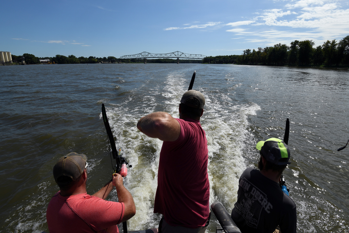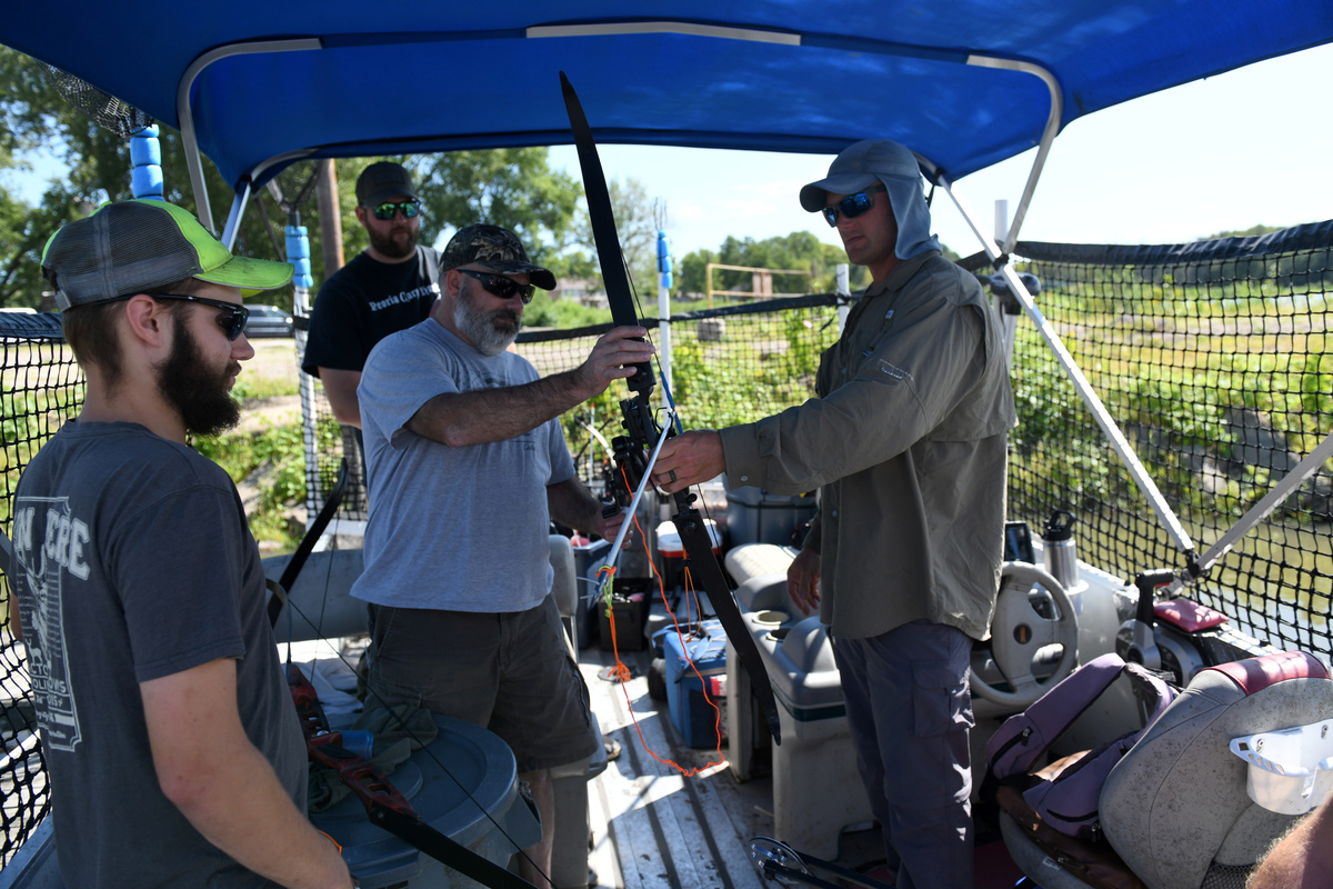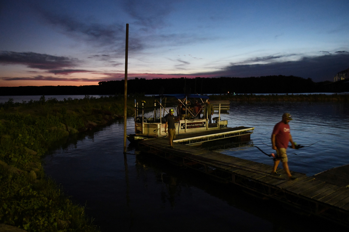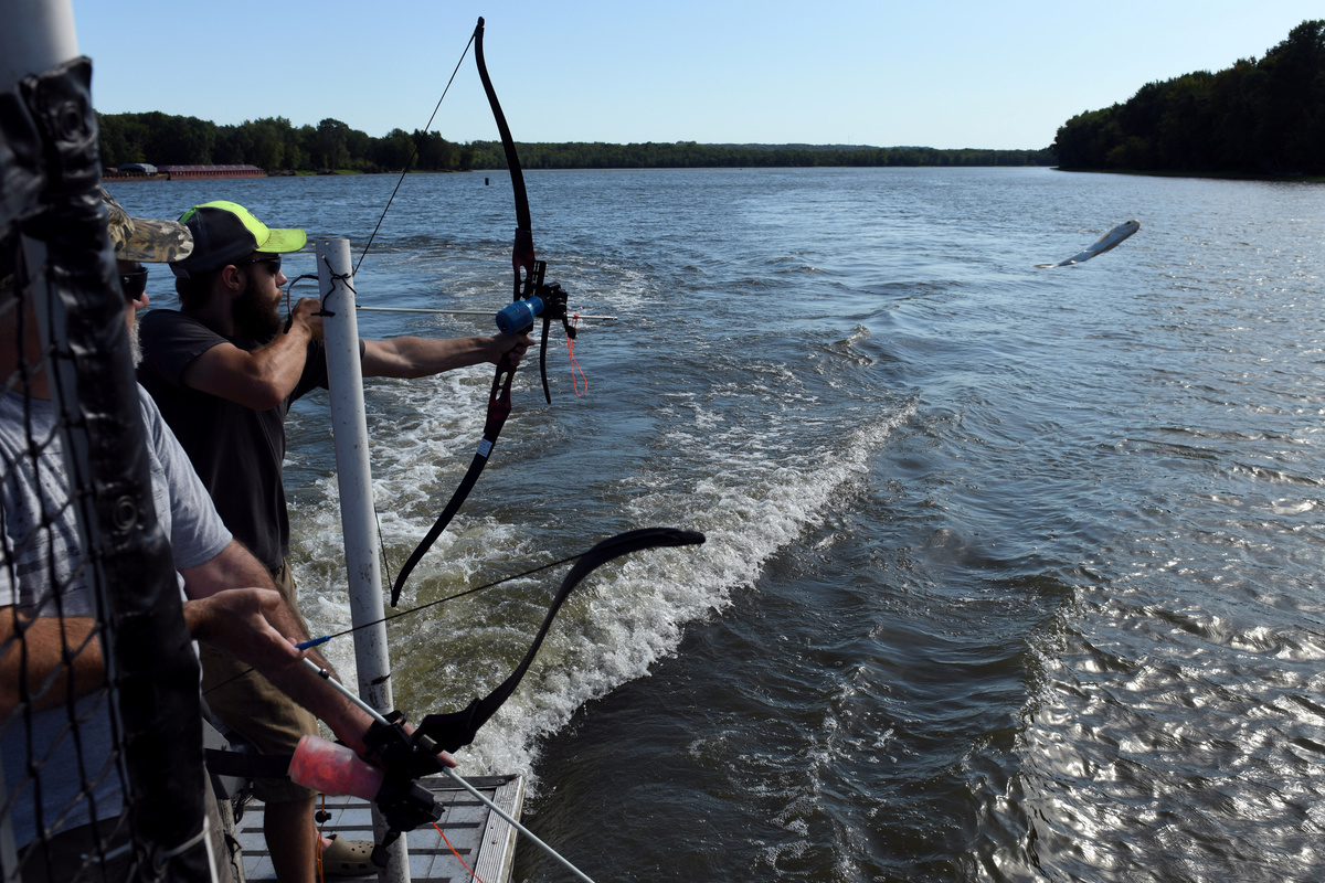 As he pilots his specially outfitted boat along the Illinois River about 100 miles (160 km) downstream from Lake Michigan, Wallick's patrons test their archery skills shooting at carp with harpoon-like arrows as the silvery, muscular fish leap several feet out of the water in the vessel's wake.