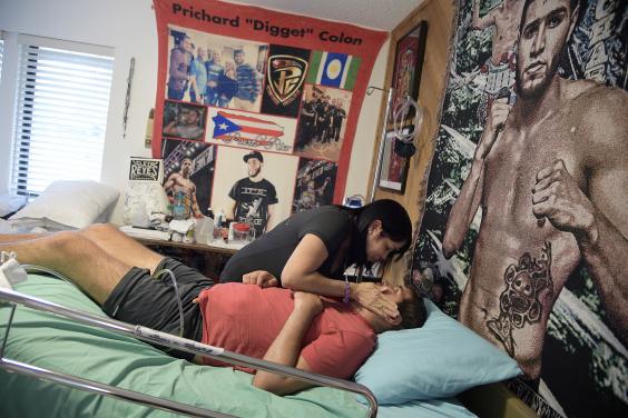 Prichard Colón, his bed tilted at a 30-degree angle, silently obliges. One blink... two blinks... three blinks. Each is deliberate, as if it requires all his strength and concentration, but it's progress, and Nieves will take all the progress she can get from her 24-year-old son.