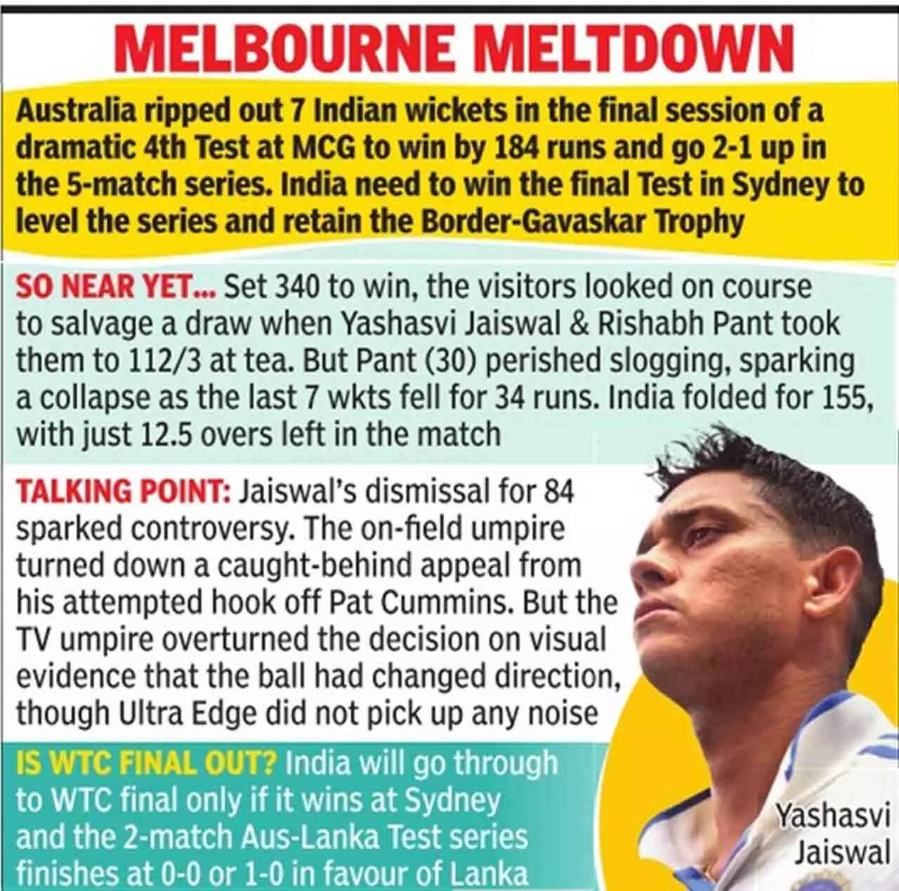 MELBOURNE: Bad judgment can break a team, as India found out the hard way here at the 'G' on Monday. Just after tea on the decisive fifth day, Rohit Sharma's men appeared to be well on their way to saving a pulsating Test match in which they had always been behind the curve but had also, till now, clawed back at crucial junctures.
