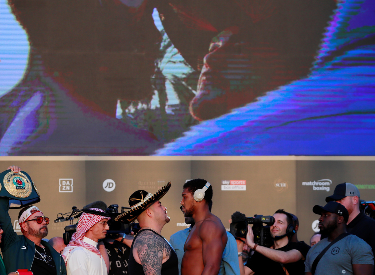 (Reuters) - Lean-looking British challenger Anthony Joshua weighed in more than three stones lighter than world heavyweight champion Andy Ruiz Jr ahead of their title rematch in Saudi Arabia on Saturday.