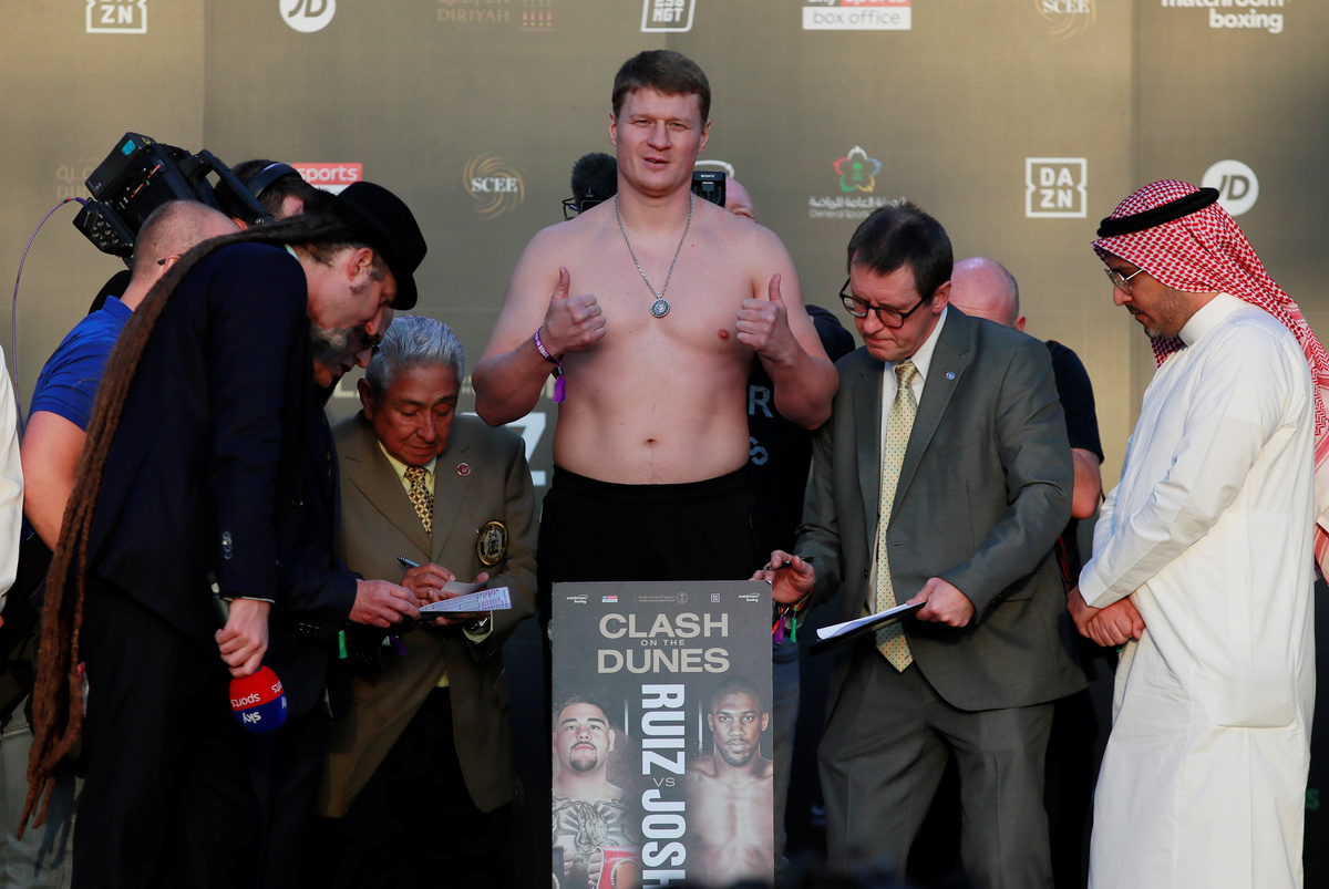 Joshua hit the scales at 16 stones and 13 pounds (107.5kg), the former champion's lightest ever weight for a world title fight, at the Diriyah venue near the capital Riyadh on Friday.