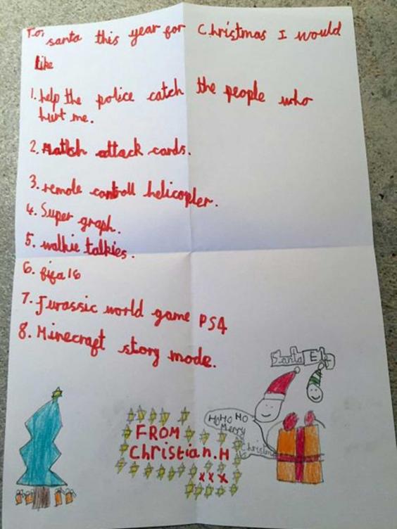 The boy, who went through surgery to repair the damage, asked Santa for a remote-controlled helicopter and a set of walkie talkies – but top of his list was an appeal to “help the police catch the people who hurt me.”