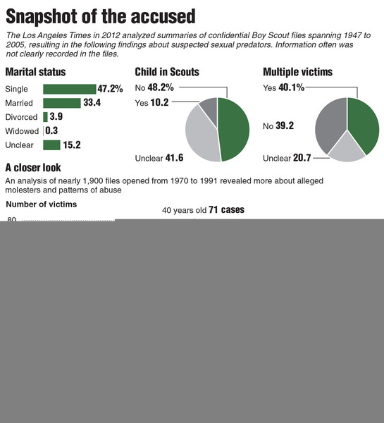 Many of the lawsuits came in the wake of the Los Angeles Times' publication in 2012 of internal Scout records involving about 5,000 men on a blacklist known as the "perversion files," a closely guarded trove of documents that details sexual abuse allegations against troop leaders and others dating back a century.