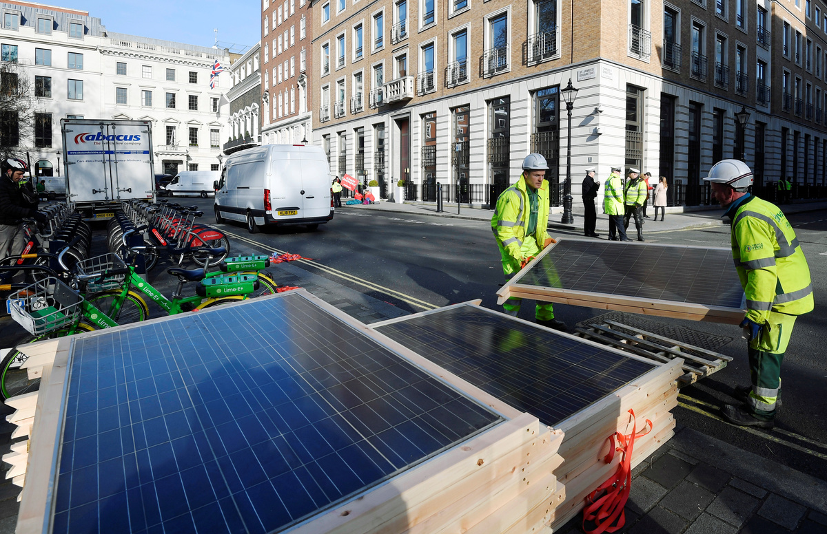 BP said more than 100 Greenpeace activists attempted to place 500 solar panels in front of BP's building in St James' Square in central London, and blocked the entrances with oil barrels.