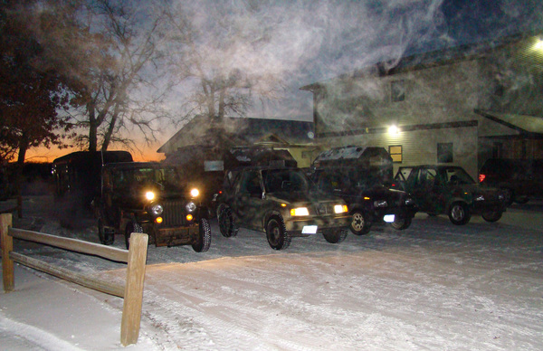 The blue-and-orange horizon just beginning to appear on the Ontario side of the Rainy River had the look of a cold day, and exhaust fog filled the air.
