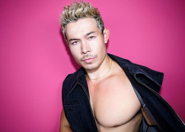 Posing against a vibrant pink backdrop, Young exudes charisma and charm as he gazes directly at the camera. The contrast between the dark blue denim and the bright pink background creates a visually captivating aesthetic that is both modern and eye-catching.