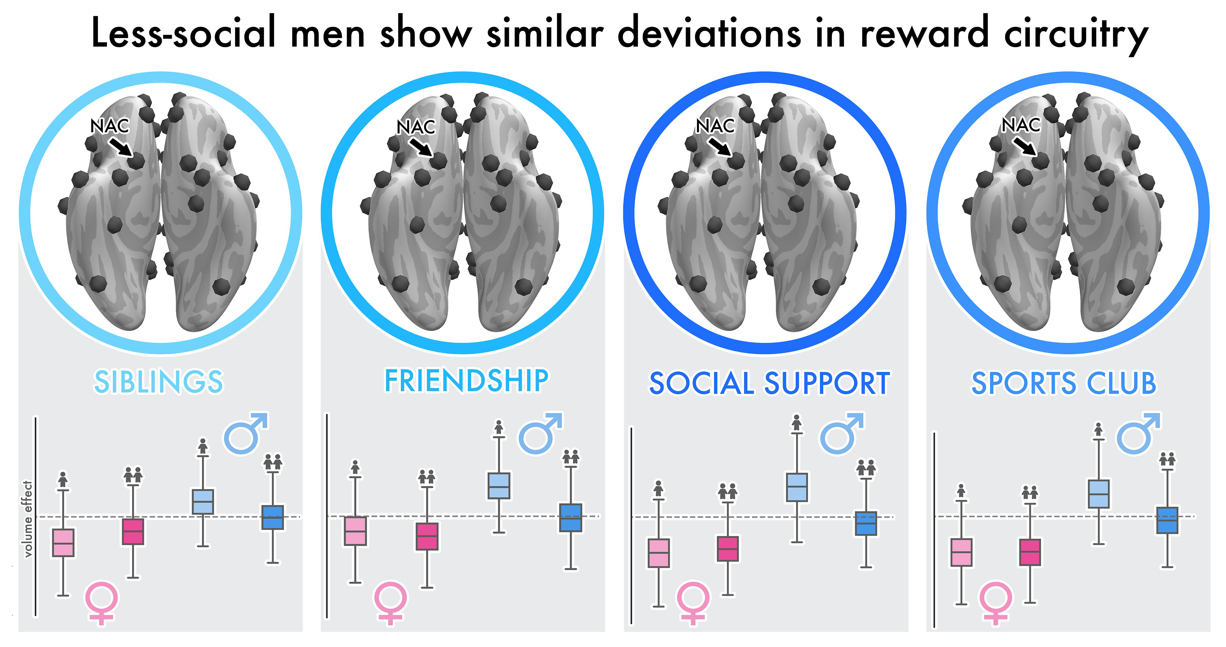 They also observed that men who had less vibrant social lives showed similar volume effects in components of the social brain that are tied to rewards, such as the nucleus accumbens.