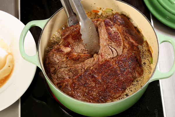 3. Return the meat to the pot with enough liquid _ beer, wine, stock, water _ to come halfway up the sides of the meat. Add any other flavoring ingredients. Bring to a boil, then cover and simmer over low heat on the stove-top or in a 325-degree oven until the meat is falling apart. This can be anywhere from one to several hours, depending on the size and cut of the meat.