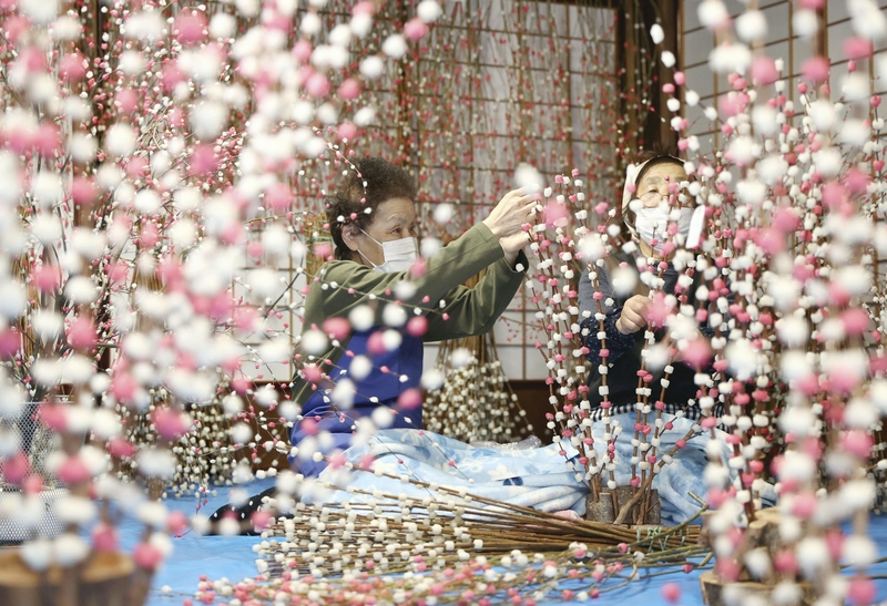 Women make hanamochi New Year decorations at a workshop in Takayama, Gifu Prefecture, on Tuesday. White and pink mochi rice cakes are rolled around branches of willow, plum and other trees to make the traditional ornaments, used to adorn entrance halls or tokonoma alcoves during the New Year holidays. Recently, hanamochi has been added to ikebana flower arrangements, and branches can extend for as long as 2 meters. The production process will continue until around Dec. 25, and the decorations will be available in the Tokyo metropolitan area and Kansai region as well.