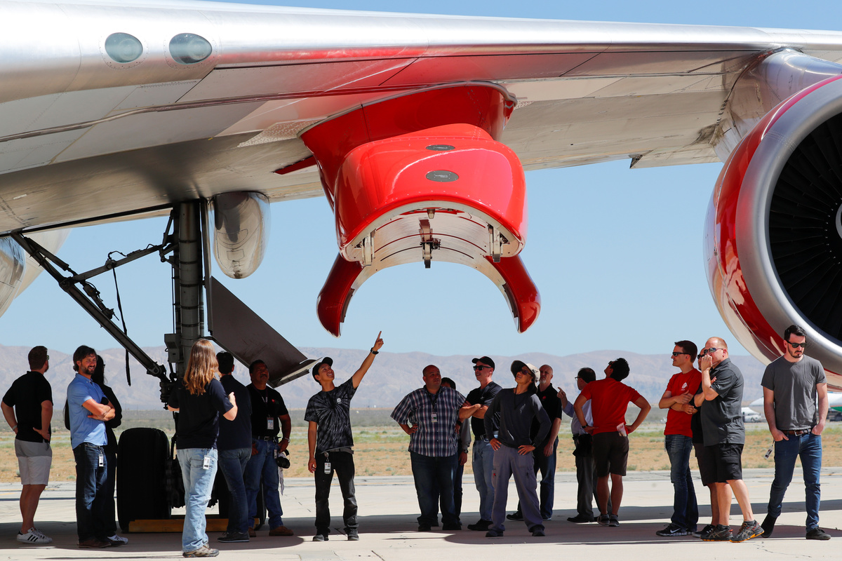 Virgin Orbit staff look over the launch device underneath the wing of a modified Boeing 747 jetliner, after a key drop test of its high-altitude launch system for satellites from Mojave, California, U.S. July 10, 2019. REUTERS/Mike Blake