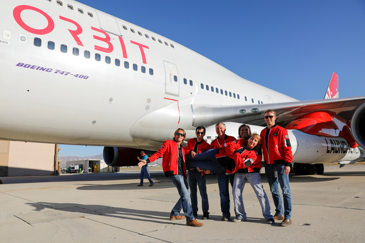 Virgin Orbit's chief test pilot Kelly Litmer is lifted by friends before piloting a successful test flight and drop of a rocket underneath the wing of a modified Boeing 747 jetliner, during a key drop test of its high-altitude launch system for satellites from Mojave, California, U.S. July 10, 2019. REUTERS/Mike Blake