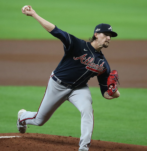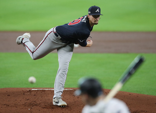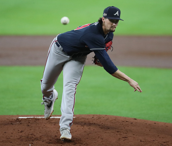 Atlanta Braves starting pitcher Kyle Wright delivers against the Miami Marlins during the first inning in Game 3 of a National League Division Series on Thursday, Oct. 8, 2020 at Minute Maid Park in Houston, Texas. (Curtis Compton/Atlanta Journal-Constitution/TNS)