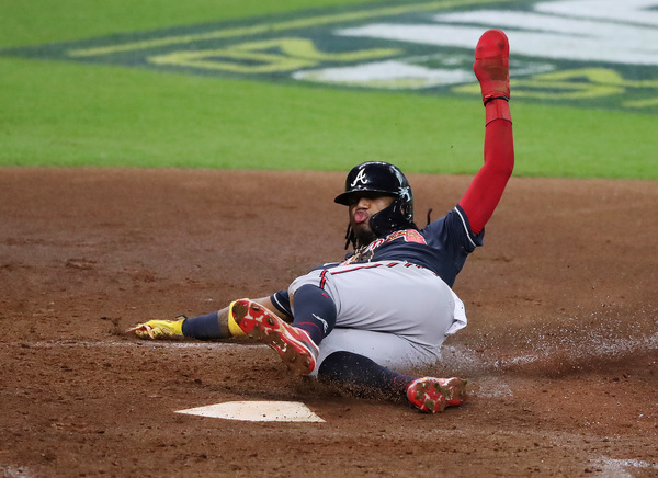 Atlanta Braves' Ronald Acuna scores from first on a double by Freddie Freeman for a 5-0 lead over the Miami Marlins during the fourth inning in Game 3 of a National League Division Series on Thursday, Oct. 8, 2020 at Minute Maid Park in Houston, Texas. (Curtis Compton/Atlanta Journal-Constitution/TNS)