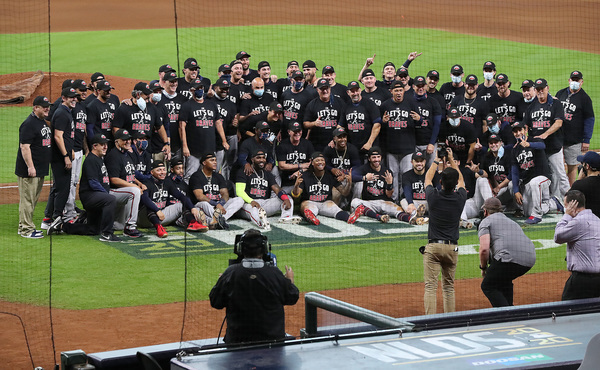 The Atlanta Braves celebrate advancing to the NL Championship Series by defeating the Marlins 7-0 in Game 3 of the National League Division Series on Thursday, Oct. 8, 2020 at Minute Maid Park in Houston, Texas. The Braves completed their second consecutive postseason series sweep. (Curtis Compton/Atlanta Journal-Constitution/TNS)