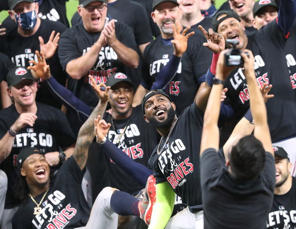 The Atlanta Braves celebrate advancing to the NL Championship Series by defeating the Marlins 7-0 in Game 3 of the National League Division Series on Thursday, Oct. 8, 2020 at Minute Maid Park in Houston, Texas. The Braves completed their second consecutive postseason series sweep. (Curtis Compton/Atlanta Journal-Constitution/TNS)Atlanta Braves catcher Travis d'Arnaud is interviewed after advancing to the NL Championship Series by defeating the Marlins 7-0 in Game 3 of the National League Division Series on Thursday, Oct. 8, 2020 at Minute Maid Park in Houston, Texas. The Braves completed their second consecutive postseason series sweep. (Curtis Compton/Atlanta Journal-Constitution/TNS)Atlanta Braves' Travis d'Arnaud scores on a sacrifice fly by Dansby Swanson for a 4-0 lead over the Miami Marlins during the third inning in Game 3 of a National League Division Series on Thursday, Oct. 8, 2020 at Minute Maid Park in Houston, Texas. (Curtis Compton/Atlanta Journal-Constitution/TNS)It's selfie time, led by Marcell Ozuna (right) with Ronald Acuna and Ozzie Albies, as the Atlanta Braves celebrate advancing to the NL Championship Series by defeating the Marlins 7-0 in Game 3 of the National League Division Series on Thursday, Oct. 8, 2020 at Minute Maid Park in Houston, Texas. The Braves completed their second consecutive postseason series sweep. (Curtis Compton/Atlanta Journal-Constitution/TNS)Atlanta Braves starting pitcher Kyle Wright delivers against the Miami Marlins during the first inning in Game 3 of a National League Division Series on Thursday, Oct. 8, 2020 at Minute Maid Park in Houston, Texas. (Curtis Compton/Atlanta Journal-Constitution/TNS)Atlanta Braves starting pitcher Kyle Wright delivers against the Miami Marlins during the first inning in Game 3 of a National League Division Series on Thursday, Oct. 8, 2020 at Minute Maid Park in Houston, Texas. (Curtis Compton/Atlanta Journal-Constitution/TNS)Atlanta Braves closing pitcher Shane Greene and catcher Travis d'Arnaud do a chest bump, beating the Miami Marlins 7-0 in Game 3 of the National League Division Series on Thursday, Oct. 8, 2020 at Minute Maid Park in Houston, Texas. (Curtis Compton/Atlanta Journal-Constitution/TNS)Atlanta Braves' Ronald Acuna scores from first on a double by Freddie Freeman for a 5-0 lead over the Miami Marlins during the fourth inning in Game 3 of a National League Division Series on Thursday, Oct. 8, 2020 at Minute Maid Park in Houston, Texas. (Curtis Compton/Atlanta Journal-Constitution/TNS)Atlanta Braves starting pitchers Max Fried (from left), catcher Travis d'Arnaud, Ian Anderson, and Kyle Wright celebrate advancing to the NL Championship Series by defeating the Marlins 7-0 in Game 3 of the National League Division Series on Thursday, Oct. 8, 2020 at Minute Maid Park in Houston, Texas. The Braves completed their second consecutive postseason series sweep. (Curtis Compton/Atlanta Journal-Constitution/TNS)Atlanta Braves Ronald Acuna gets five from Travis d'Arnaurd, scoring on a RBI-single by Marcell Ozuna for a 1-0 lead over the Miami Marlins during the third inning in Game 3 of a National League Division Series on Thursday, Oct. 8, 2020 at Minute Maid Park in Houston, Texas. (Curtis Compton/Atlanta Journal-Constitution/TNS)It's selfie time, led by Marcell Ozuna (right) with Ronald Acuna and Ozzie Albies, as the Atlanta Braves celebrate advancing to the NL Championship Series by defeating the Marlins 7-0 in Game 3 of the National League Division Series on Thursday, Oct. 8, 2020 at Minute Maid Park in Houston, Texas. The Braves completed their second consecutive postseason series sweep. (Curtis Compton/Atlanta Journal-Constitution/TNS)Atlanta Braves' Ozzie Albies stirs the drink with a double against the Miami Marlins during the fifth inning in Game 3 of a National League Division Series on Thursday, Oct. 8, 2020 at Minute Maid Park in Houston, Texas. (Curtis Compton/Atlanta Journal-Constitution/TNS)Atlanta Braves starting pitchers Ian Anderson (from left), Max Fried and Kyle Wright celebrate advancing to the NL Championship Series by defeating the Marlins 7-0 in Game 3 of the National League Division Series on Thursday, Oct. 8, 2020 at Minute Maid Park in Houston, Texas. The Braves completed their second consecutive postseason series sweep. (Curtis Compton/Atlanta Journal-Constitution/TNS)Atlanta Braves starting pitchers Ian Anderson (from left), Max Fried and Kyle Wright get a photo taken while they celebrate advancing to the NL Championship Series by defeating the Marlins 7-0 in Game 3 of the National League Division Series on Thursday, Oct. 8, 2020 at Minute Maid Park in Houston, Texas. The Braves completed their second consecutive postseason series sweep. (Curtis Compton/Atlanta Journal-Constitution/TNS)Atlanta Braves' Ronald Acuna draws a walk against the Miami Marlins during the third inning in Game 3 of a National League Division Series on Thursday, Oct. 8, 2020 at Minute Maid Park in Houston, Texas. (Curtis Compton/Atlanta Journal-Constitution/TNS)The Atlanta Braves celebrate advancing to the NL Championship Series by defeating the Marlins 7-0 in Game 3 of the National League Division Series on Thursday, Oct. 8, 2020 at Minute Maid Park in Houston, Texas. The Braves completed their second consecutive postseason series sweep. (Curtis Compton/Atlanta Journal-Constitution/TNS)