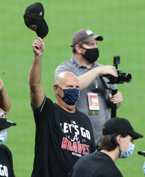 Atlanta Braves manager Brian Snitker tips his cap, celebrating with his team as they advance to the NL Championship Series by defeating the Marlins 7-0 in Game 3 of the National League Division Series on Thursday, Oct. 8, 2020 at Minute Maid Park in Houston, Texas. The Braves completed their second consecutive postseason series sweep. (Curtis Compton/Atlanta Journal-Constitution/TNS)