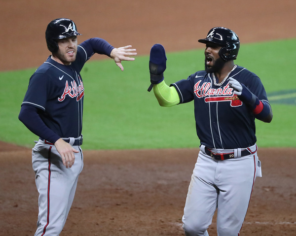 Atlanta Braves' Freedie Freeman (left) and Marcell Ozuna score on a RBI-double by Travis d'Arnaud for a 3-0 lead over the Miami Marlins during the third inning in Game 3 of a National League Division Series on Thursday, Oct. 8, 2020 at Minute Maid Park in Houston, Texas. (Curtis Compton/Atlanta Journal-Constitution/TNS)