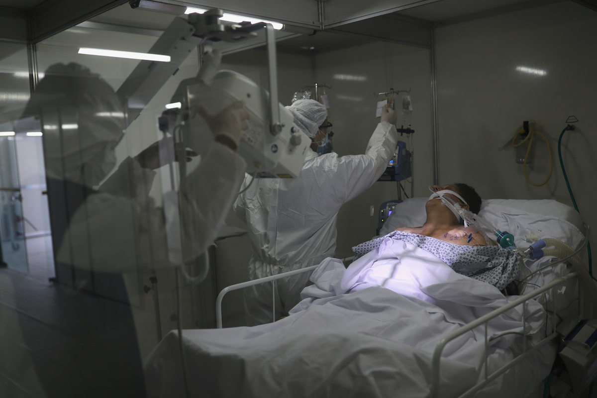 FILE PHOTO: Members of medical staff, wearing protective suits and face masks, do a lung X-ray on a patient suffering from coronavirus disease (COVID-19) in the Intensive Care Unit (ICU) at a field hospital set up to treat patients suffering from the disease (COVID-19) in Guarulhos, Sao Paulo state, Brazil, May 12, 2020. REUTERS/Amanda Perobelli