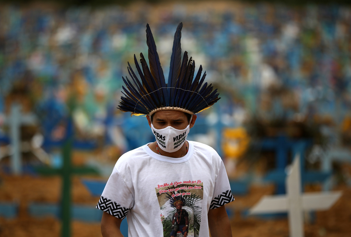 Indigenous person Miqueias Moreira Kokama, wears a protective face mask with words that read:"Indigenous lives matter", during a visit to his father's grave, indigenous Chief Messias Kokama, who passed away due to the coronavirus disease (COVID-19), at the Parque Taruma cemetery in Manaus, Brazil, May 26, 2020. REUTERS/Bruno Kelly