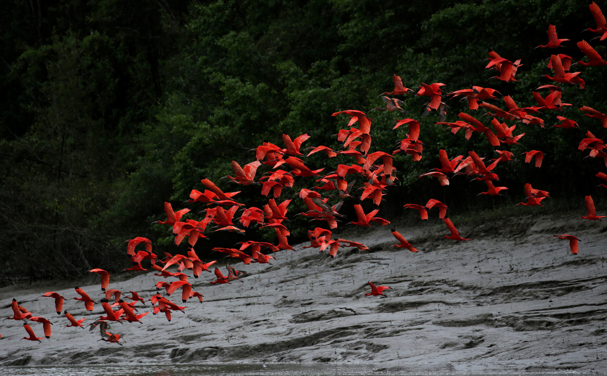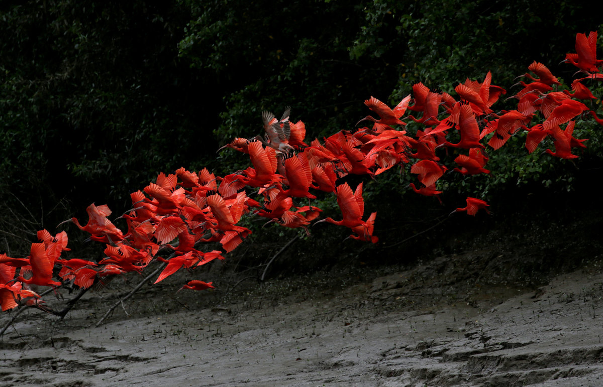 Scarlet ibis are pictured on the banks of a mangrove swamp located on the mouth of the Calcoene River where it joins the Atlantic Ocean on the coast of Amapa state, northern Brazil, April 6, 2017. Picture taken on April 6, 2017. REUTERS/Ricardo Moraes