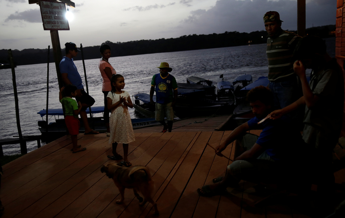 People gather at a small port from where boats cross the Oiapoque river between the Oiapoque city, extreme northern Brazil and the French Guiana in Oiapoque April 2, 2017. The French Guiana is seen in the background. Picture taken on April 2, 2017. REUTERS/Ricardo Moraes
