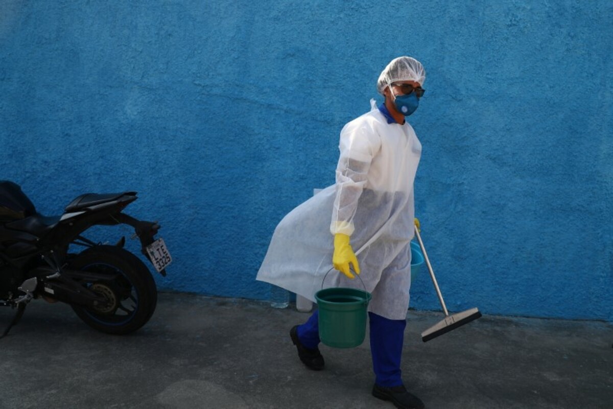 A cleaning worker prepares to disinfect an Emergency Mobile Care Service (SAMU) ambulance after taking a suspected COVID-19 patient, amid the coronavirus disease (COVID-19) outbreak, in the Moacyr do Carmo hospital in Duque de Caxias near Rio de Janeiro, Brazil May 20, 2021. REUTERS/Pilar Olivares