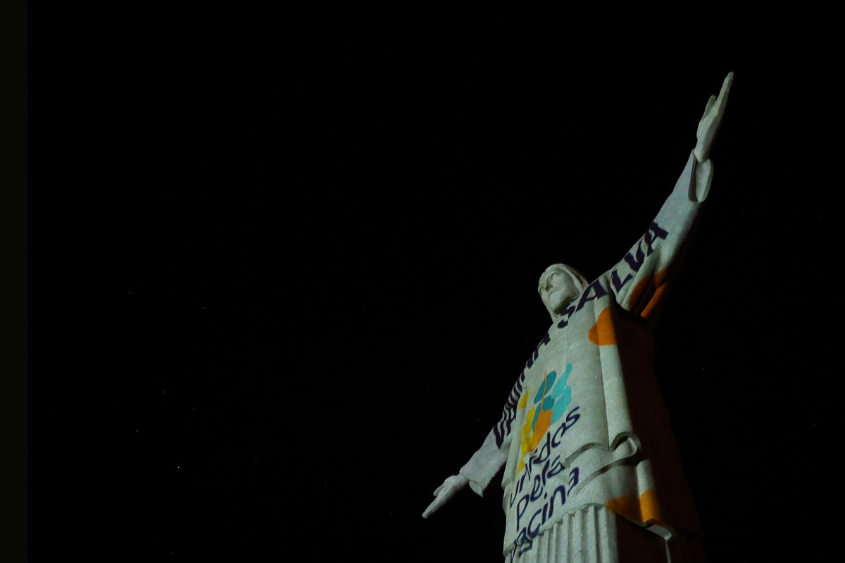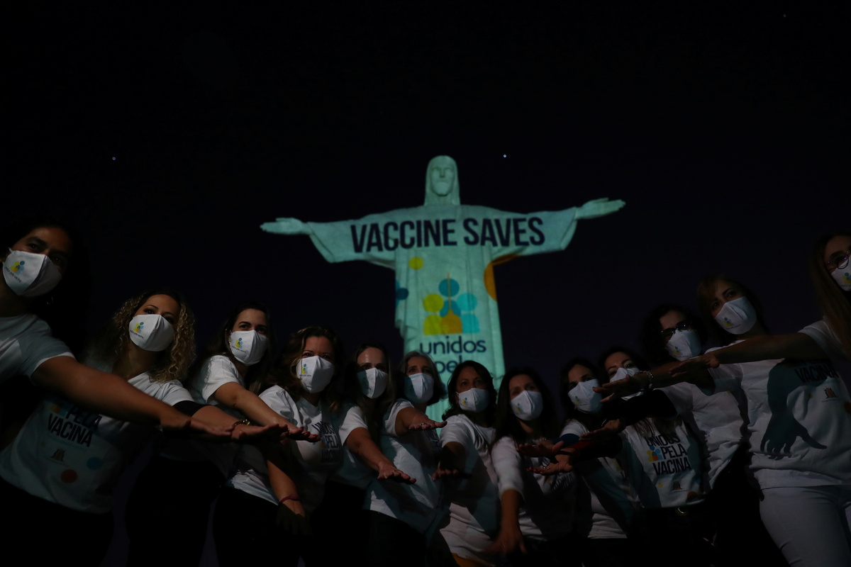 The message "Vaccine saves, United for vaccines" was projected on Saturday onto the 98-foot (30-meter) statue by Unidos Pela Vacina (United by the Vaccine), in partnership with the Cristo Redentor Sanctuary and the Ogilvy Brazil advertising agency.