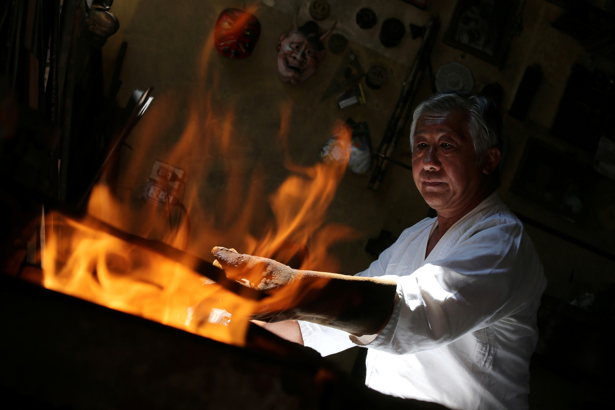 Suemitsu forges the blade, made of Austrian steel, over an open flame. He spends days sharpening the swords by hand over a wet stone.