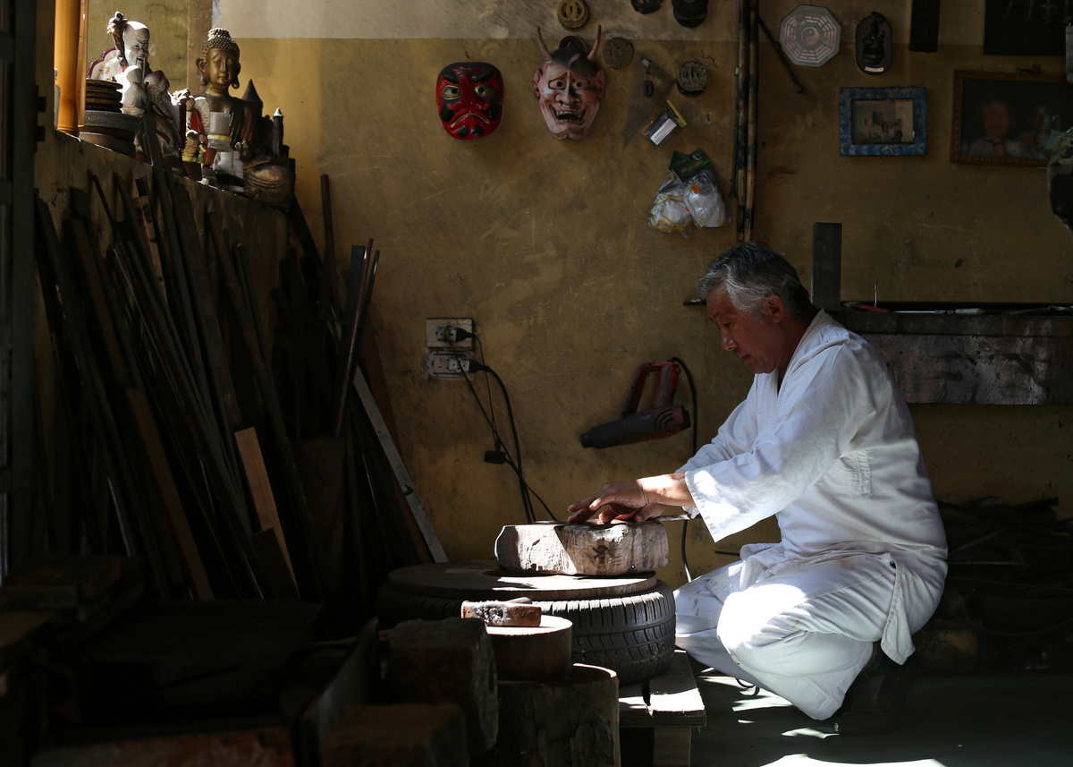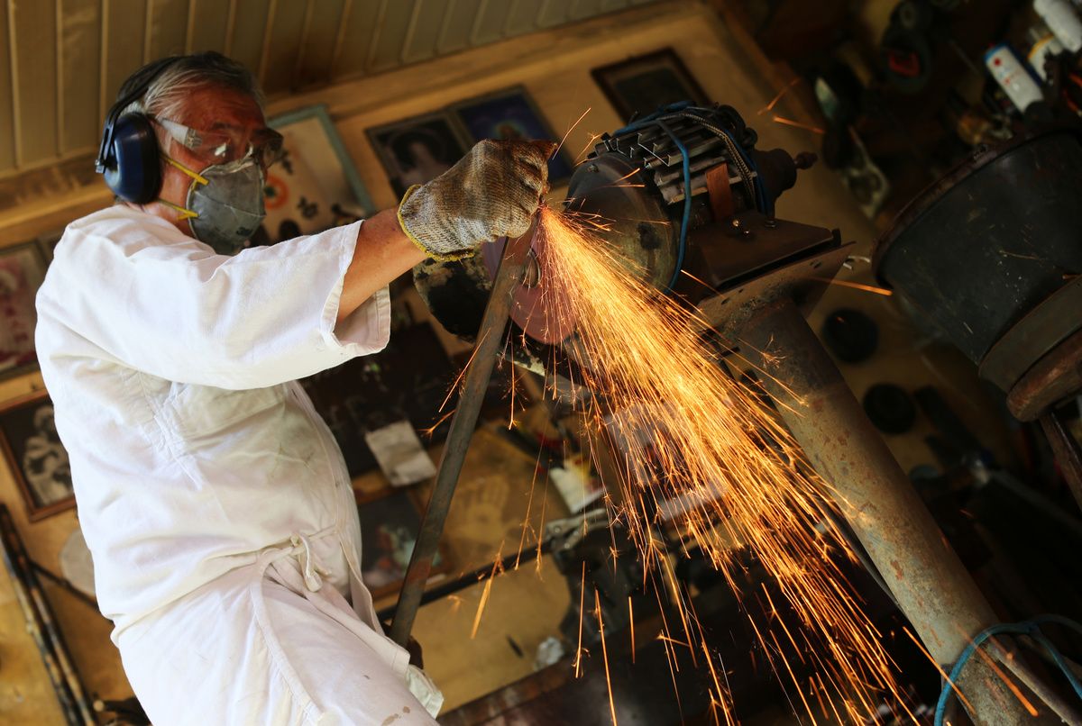 But enter the gates and you'll find a lush garden, overarched by a large, red Japanese gate known as a torii. In the garage, more often than not, Suemitsu can be found hunched over a grindstone or workbench, working on one of the hundreds of swords he has made over the years.