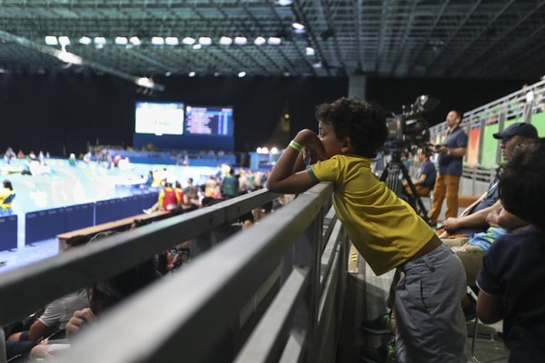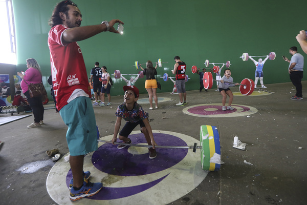 About 200 yards from where Dos Santos stood above the table tennis competition, Jaquelin Reis and 13 other family members filed into Pavilion 2 for the afternoon weightlifting competition, filling nearly two rows in the half-empty bleachers. The family is dressed alike in white T-shirts adorned with a photo of Brazilian weightlifter Rosane dos Reis Santos, the relative they've come to cheer.