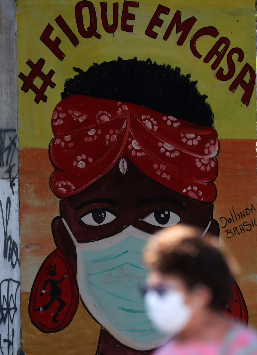 A person walks near a graffiti depicting a woman wearing a protective face mask, following the outbreak of the coronavirus disease (COVID-19), in Rio de Janeiro, Brazil, June 8, 2020. The graffiti reads: "Stay at home". REUTERS/Sergio Moraes