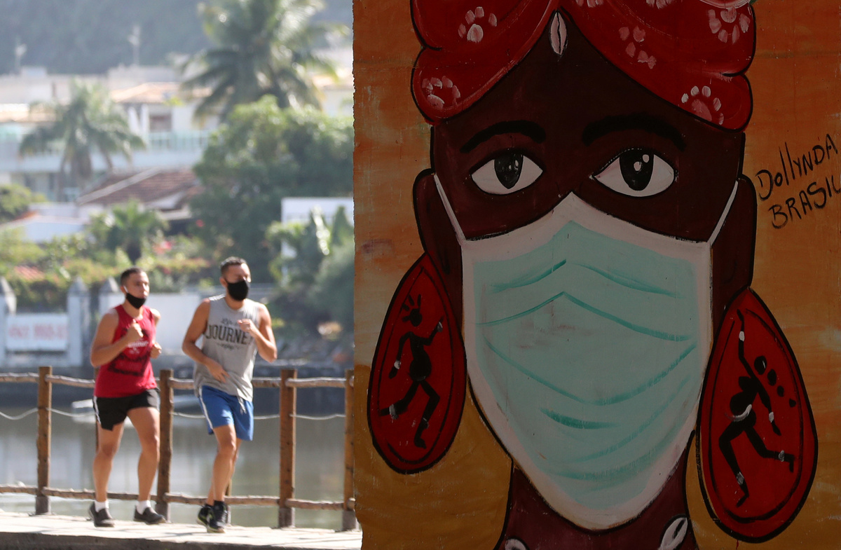 Men run near a graffiti depicting a woman wearing a protective face mask, following the outbreak of the coronavirus disease (COVID-19), in Rio de Janeiro, Brazil, June 8, 2020. REUTERS/Sergio Moraes