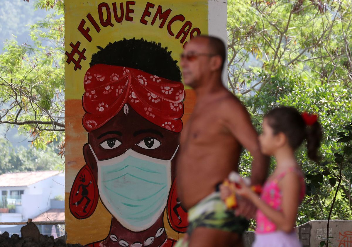 A man and a child walk near a graffiti depicting a woman wearing a protective face mask, following the outbreak of the coronavirus disease (COVID-19), in Rio de Janeiro, Brazil, June 8, 2020. The graffiti reads: "Stay at home". REUTERS/Sergio Moraes