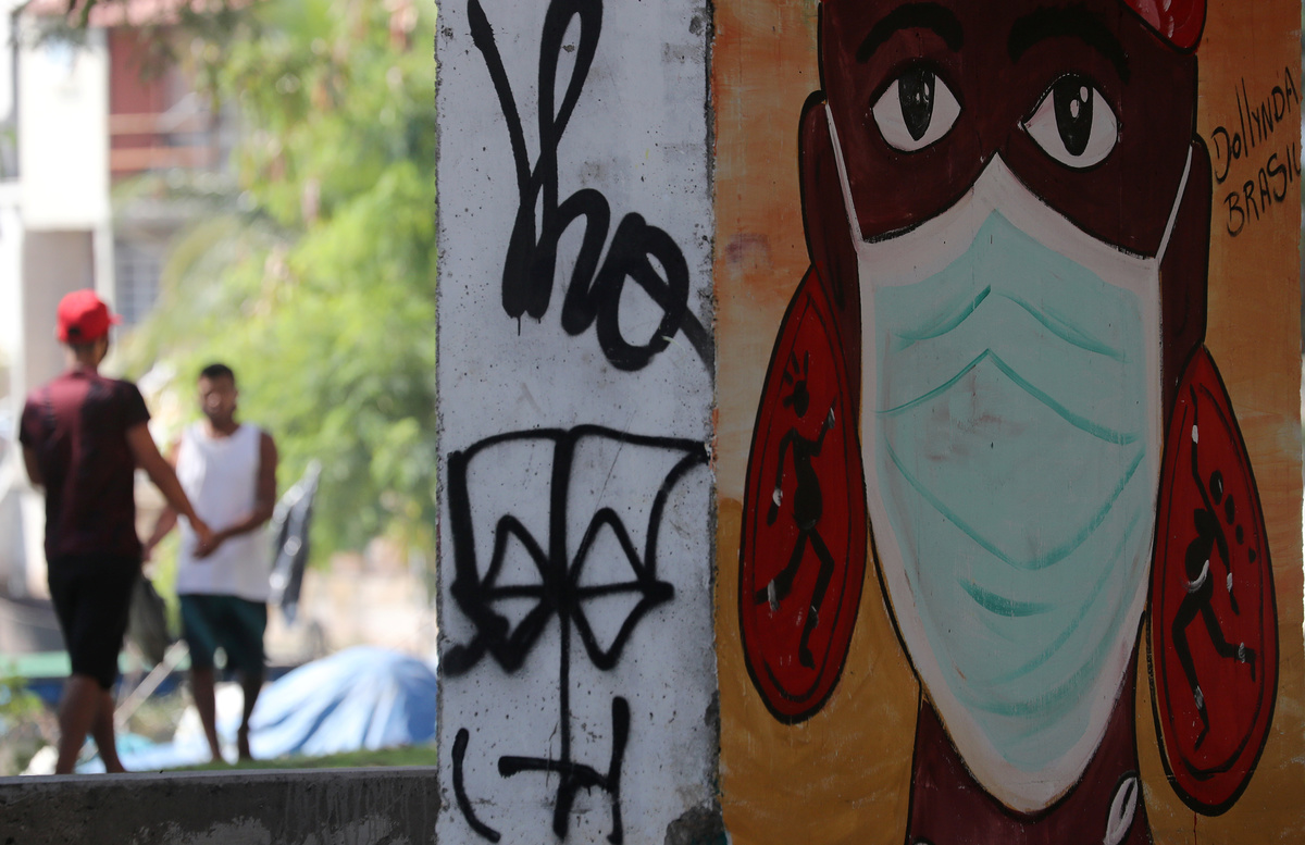 Men walk near a graffiti depicting a woman wearing a protective face mask, following the outbreak of the coronavirus disease (COVID-19), in Rio de Janeiro, Brazil, June 8, 2020. REUTERS/Sergio Moraes