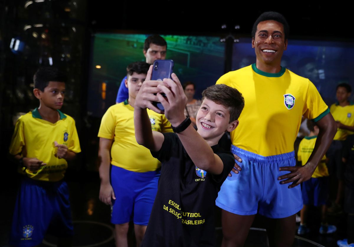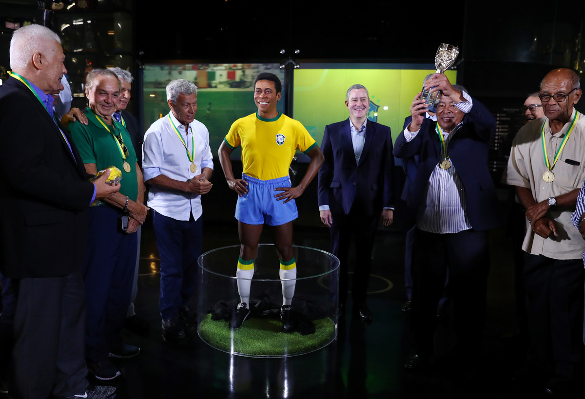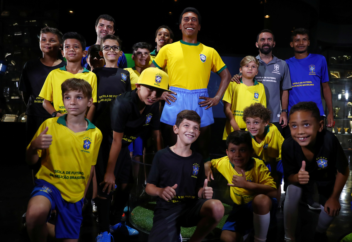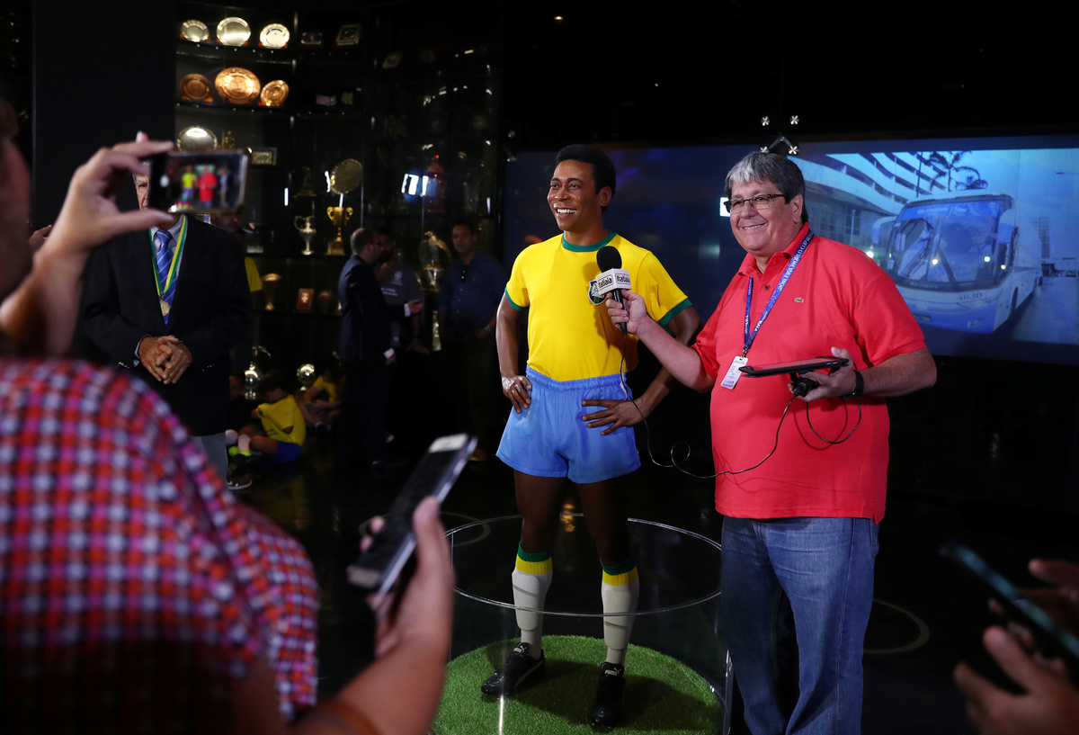 Pele's statue unveiled on the 50th anniversary of the 1970 World Cup victory - CBF Headquarters, Rio de Janeiro, Brazil - February 20, 2020 A journalist pretends to interview Pele's statue during the 50th anniversary of the 1970 World Cup victory REUTERS/Pilar OlivaresPele's statue unveiled on the 50th anniversary of the 1970 World Cup victory - CBF Headquarters, Rio de Janeiro, Brazil - February 20, 2020 General view of the statue of Pele during the 50th anniversary of the 1970 World Cup victory REUTERS/Pilar OlivaresPele's statue unveiled on the 50th anniversary of the 1970 World Cup victory - CBF Headquarters, Rio de Janeiro, Brazil - February 20, 2020 1970 World Cup champion Jairzinho raises a replica of the Jules Rimet trophy during the unveiling of the statue of Pele REUTERS/Pilar OlivaresPele's statue unveiled on the 50th anniversary of the 1970 World Cup victory - CBF Headquarters, Rio de Janeiro, Brazil - February 20, 2020 Brazilian Football Confederation President Rogerio Caboclo and 1970 World Cup champions Roberto and Clodoaldo during the unveiling of the statue of Pele REUTERS/Pilar Olivares