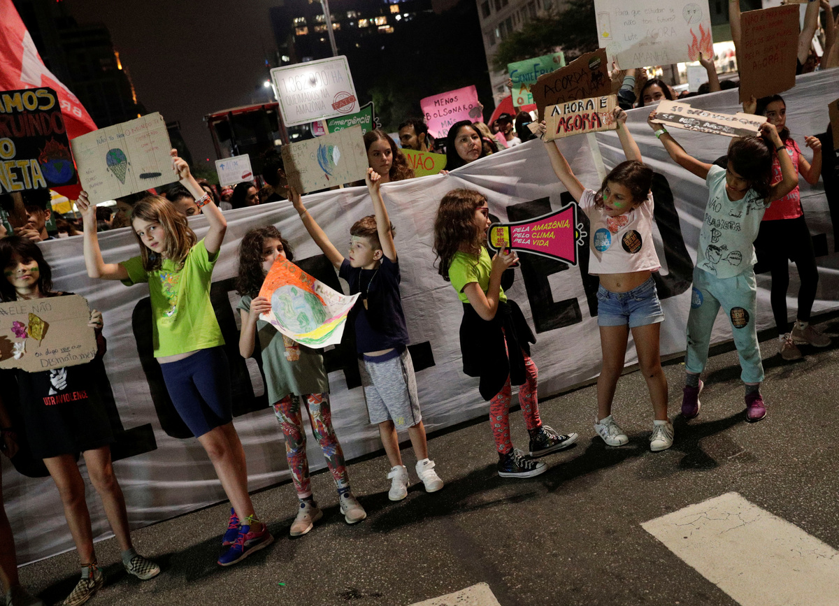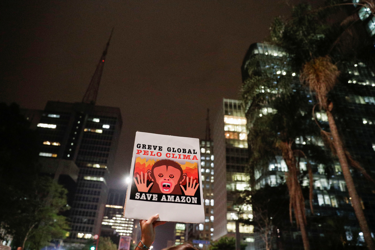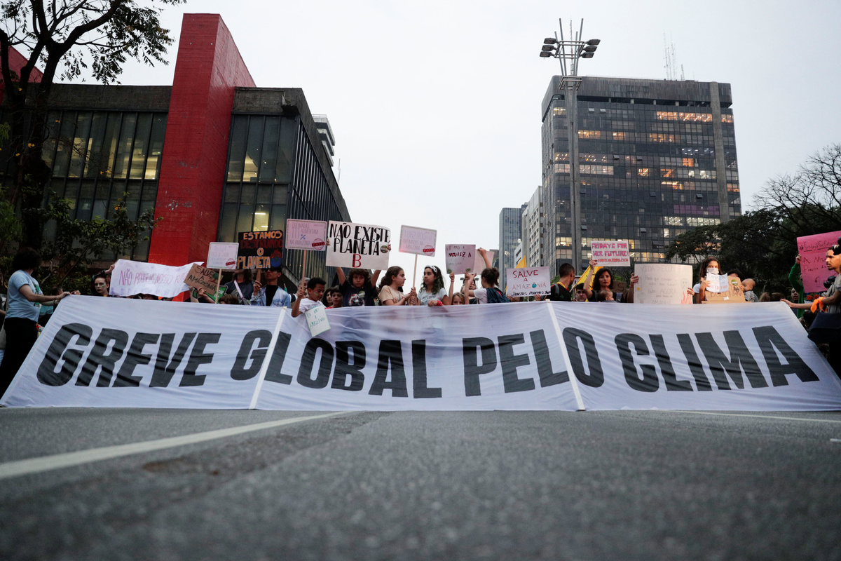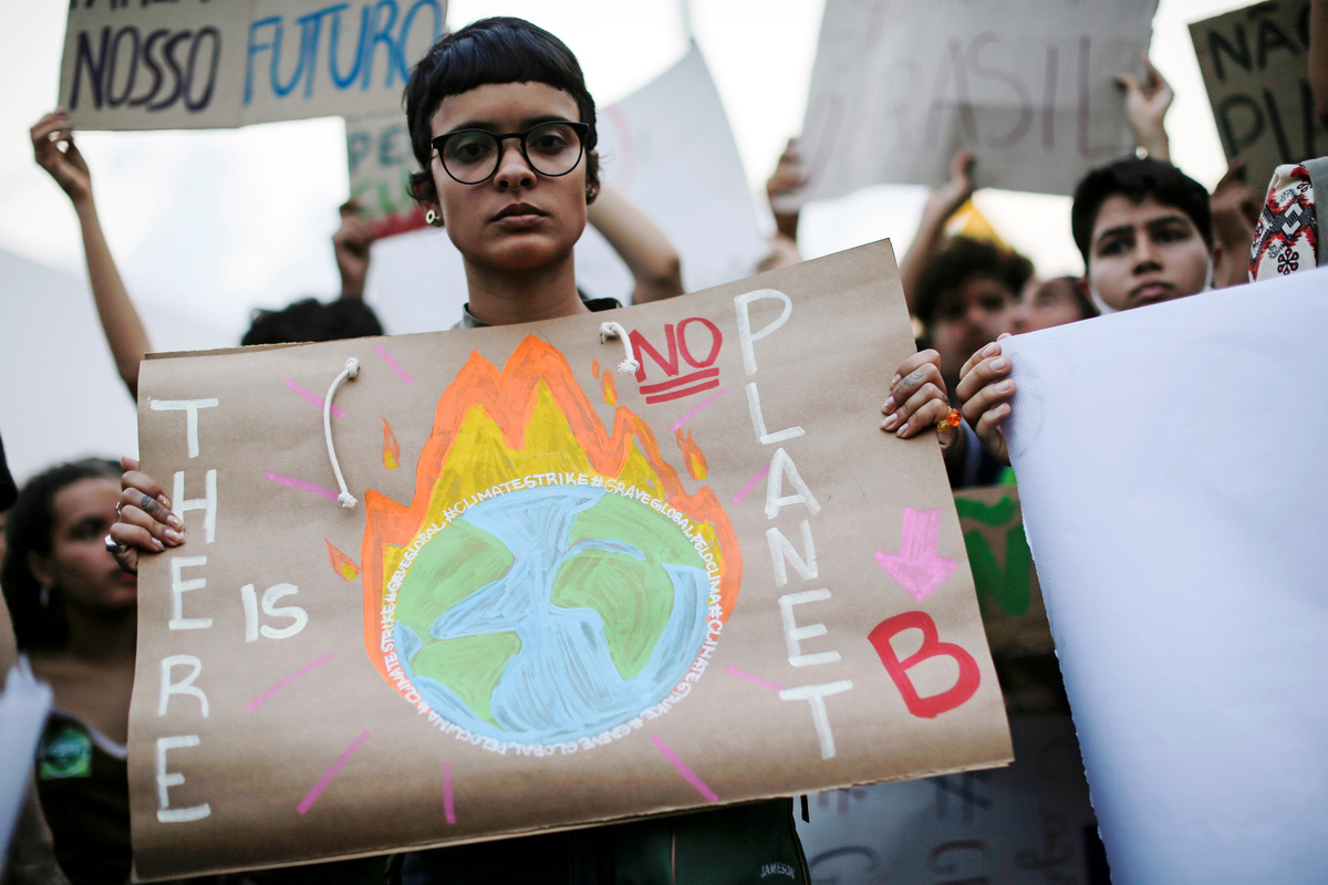 A demonstrator takes part in the Global Climate Strike of the Fridays for Future movement in Brasilia, Brazil September 20, 2019. REUTERS/Adriano MachadoA demonstrator takes part in the Global Climate Strike of the Fridays for Future movement in Brasilia, Brazil September 20, 2019. REUTERS/Adriano MachadoDemonstrators take part in the Global Climate Strike of the Fridays for Future movement in Brasilia, Brazil September 20, 2019. REUTERS/Adriano MachadoA person holds an earth globe during the Global Climate Strike of the Fridays for Future movement in Sao Paulo, Brazil September 20, 2019. REUTERS/Nacho DoceKids hold placards as they take part in the Global Climate Strike of the Fridays for Future movement in Sao Paulo, Brazil September 20, 2019. REUTERS/Nacho Doce People hold placards as they take part in the Global Climate Strike of the Fridays for Future movement in Sao Paulo, Brazil September 20, 2019. REUTERS/Nacho Doce A man holds a banner during the Global Climate Strike of the Fridays for Future movement in Sao Paulo, Brazil September 20, 2019. REUTERS/Nacho Doce Children participate in the Global Climate Strike of the Fridays for Future movement in Sao Paulo, Brazil September 20, 2019. The placard reads: "Capitalism destroys the planet. Let's destroy capitalism." REUTERS/Nacho Doce People take part in the Global Climate Strike of the Fridays for Future movement in Sao Paulo, Brazil September 20, 2019. The placard reads: " Climate Emergency." REUTERS/Nacho Doce A person holds a banner during the Global Climate Strike of the Fridays for Future movement in Sao Paulo, Brazil September 20, 2019. The placard reads: " For Amazonia, for climate, for life." REUTERS/Nacho Doce People hold placards that read "How many lives is it worth?" and "Veganism saves" as they participate in a Global Climate Strike rally in Rio de Janeiro, Brazil September 20, 2019. REUTERS/Pilar OlivaresA woman looks on as she attends a Global Climate Strike rally in Rio de Janeiro, Brazil September 20, 2019. REUTERS/Pilar OlivaresA woman holds a placard during the Global Climate Strike rally in Rio de Janeiro, Brazil September 20, 2019. REUTERS/Pilar OlivaresA person holds a placard reading "Global strike for the climate" during the Global Climate Strike of the Fridays for Future movement in Sao Paulo, Brazil September 20, 2019. REUTERS/Nacho Doce A child with painted face participates in the Global Climate Strike of the Fridays for Future movement in Sao Paulo, Brazil September 20, 2019. REUTERS/Nacho DoceA kid stands next to a placard that reads "There's no Planet B" during a Global Climate Strike rally in Rio de Janeiro, Brazil September 20, 2019. REUTERS/Pilar Olivares