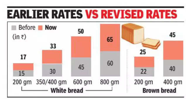 "This time, there is an average 15% increase across all brands. The smallest packet of 200gm white bread has risen from Rs 15 to Rs 17. The regular 350-400gm loaf, which most households consume, has increased from Rs 30 to Rs 33. The 600gm pack earlier cost Rs 45 and has now gone up to Rs 50. And 800gm white sandwich bread that was Rs 60, now costs Rs 65," said a vendor in Andheri Lokhandwala.