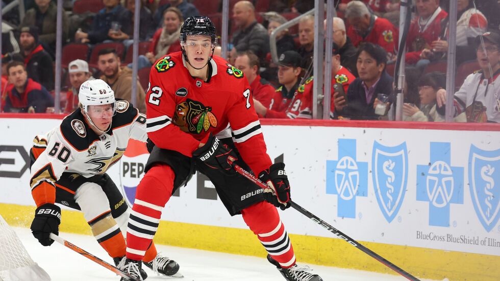 “I wouldn’t say he’s an offensive player, but he has certainly shown he can move the puck,” general manager Kyle Davidson said recently. “He has raised the ceiling beyond what some people may have [labeled] him as more of a shutdown, bottom-pair defenseman.”