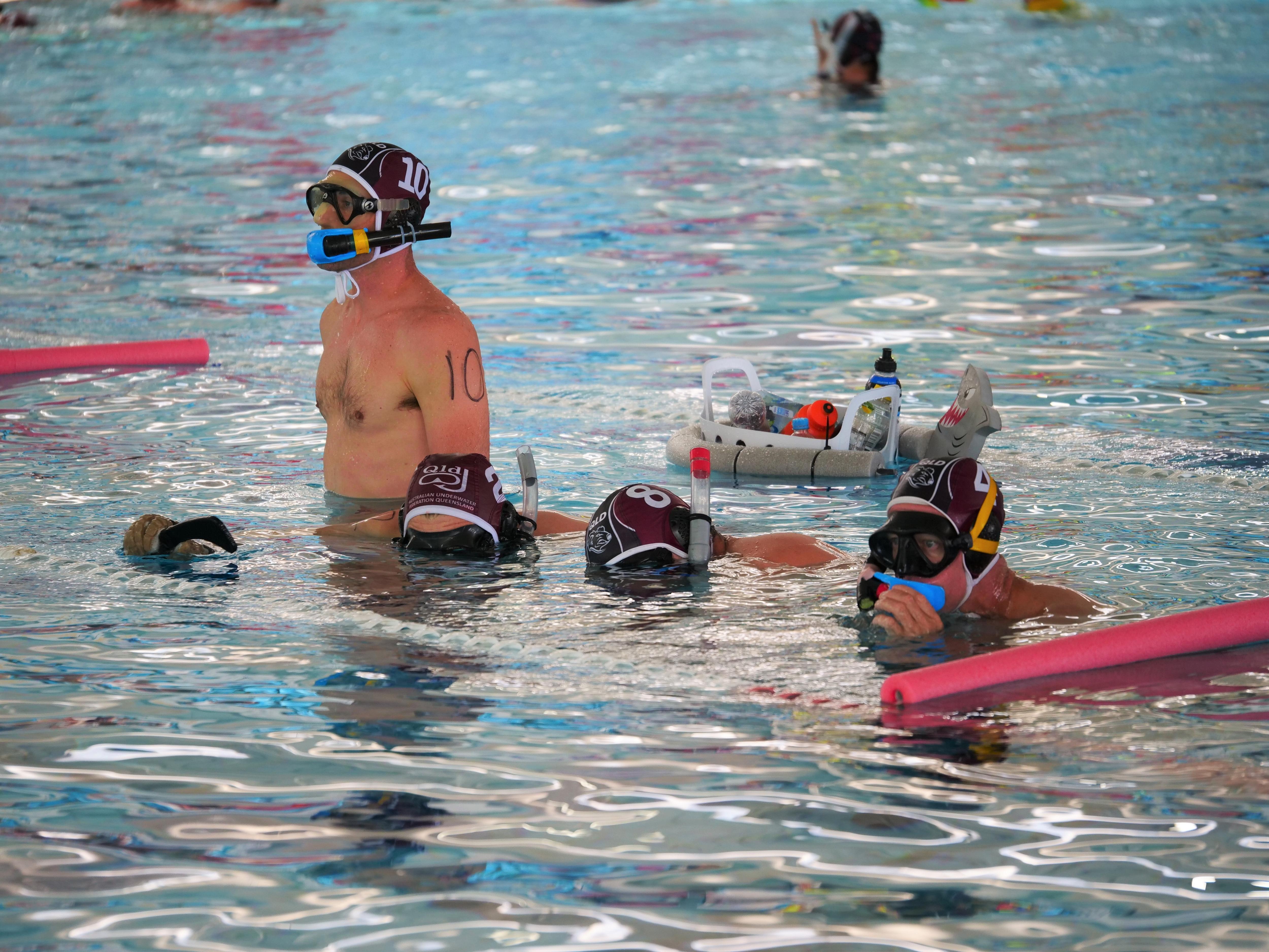 Players swim along the bottom of the pool trying to push a puck into the goals, and they cannot interfere with another player with their free hand.