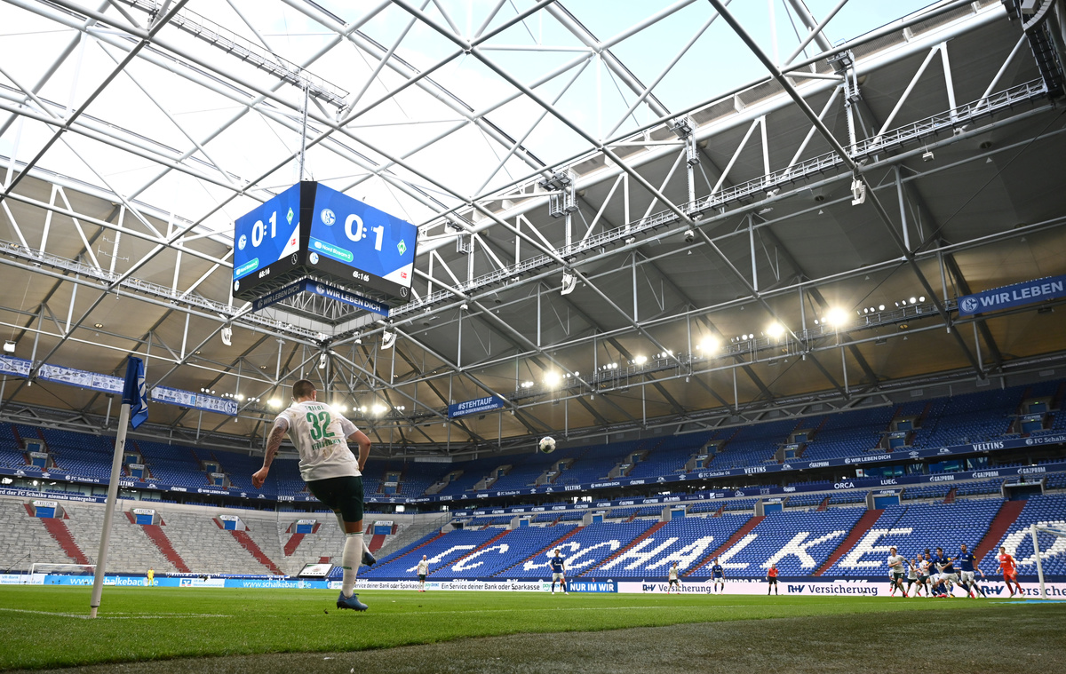 Soccer Football - Bundesliga - Schalke 04 v Werder Bremen - Veltins-Arena, Gelsenkirchen, Germany - May 30, 2020 A staff member disinfects a match ball, as play resumes behind closed doors following the outbreak of the coronavirus disease (COVID-19) Bernd Thissen/Pool via REUTERS Soccer Football - Bundesliga - Schalke 04 v Werder Bremen - Veltins-Arena, Gelsenkirchen, Germany - May 30, 2020 Werder Bremen's Leonardo Bittencourt celebrates after scoring their first goal, as play resumes behind closed doors following the outbreak of the coronavirus disease (COVID-19) Bernd Thissen/Pool via REUTERS Soccer Football - Bundesliga - Schalke 04 v Werder Bremen - Veltins-Arena, Gelsenkirchen, Germany - May 30, 2020 Schalke 04's Jean-Clair Todibo in action with Werder Bremen's Josh Sargent, as play resumes behind closed doors following the outbreak of the coronavirus disease (COVID-19) Bernd Thissen/Pool via REUTERS Soccer Football - Bundesliga - Schalke 04 v Werder Bremen - Veltins-Arena, Gelsenkirchen, Germany - May 30, 2020 Schalke 04's Ozan Kabak in action with Werder Bremen's Josh Sargent, as play resumes behind closed doors following the outbreak of the coronavirus disease (COVID-19) Bernd Thissen/Pool via REUTERS