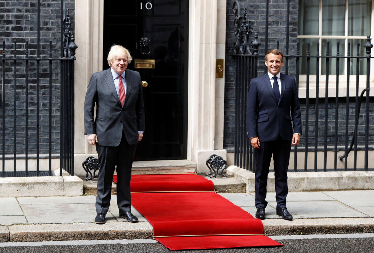 French President Emmanuel Macron gestures as he meets Britain's Prime Minister Boris Johnson at Downing Street in London, Britain, June 18, 2020. REUTERS/Hannah McKay/PoolBritish Prime Minister Boris Johnson and French President Emmanuel Macron meet at Downing Street in London, Britain June 18, 2020. REUTERS/John SibleyBritain's Prime Minister Boris Johnson meets French President Emmanuel Macron at Downing Street in London, Britain, June 18, 2020. REUTERS/Hannah McKay/PoolBritain's Camilla, Duchess of Cornwall, Britain's Prince Charles, Prince of Wales and French President Emmanuel Macron arrive to lay wreaths at the statue of former French president Charles de Gaulle at Carlton Gardens in central London on June 18, 2020 during a visit to mark the anniversary of former de Gaulle's appeal to French people to resist the Nazi occupation. - Macron visited London on June 18 to commemorate the 80th anniversary of former French president Charles de Gaulle's appeal to French people to resist the Nazi occupation during World War II, in London, Britain June 18, 202. Tolga Akmen/Pool via REUTERSBritish Prime Minister Boris Johnson reacts as he meets with French President Emmanuel Macron at Downing Street in London, Britain June 18, 2020. REUTERS/John SibleyBritain's Prime Minister Boris Johnson meets French President Emmanuel Macron at Downing Street in London, Britain, June 18, 2020. REUTERS/Hannah McKay/Pool