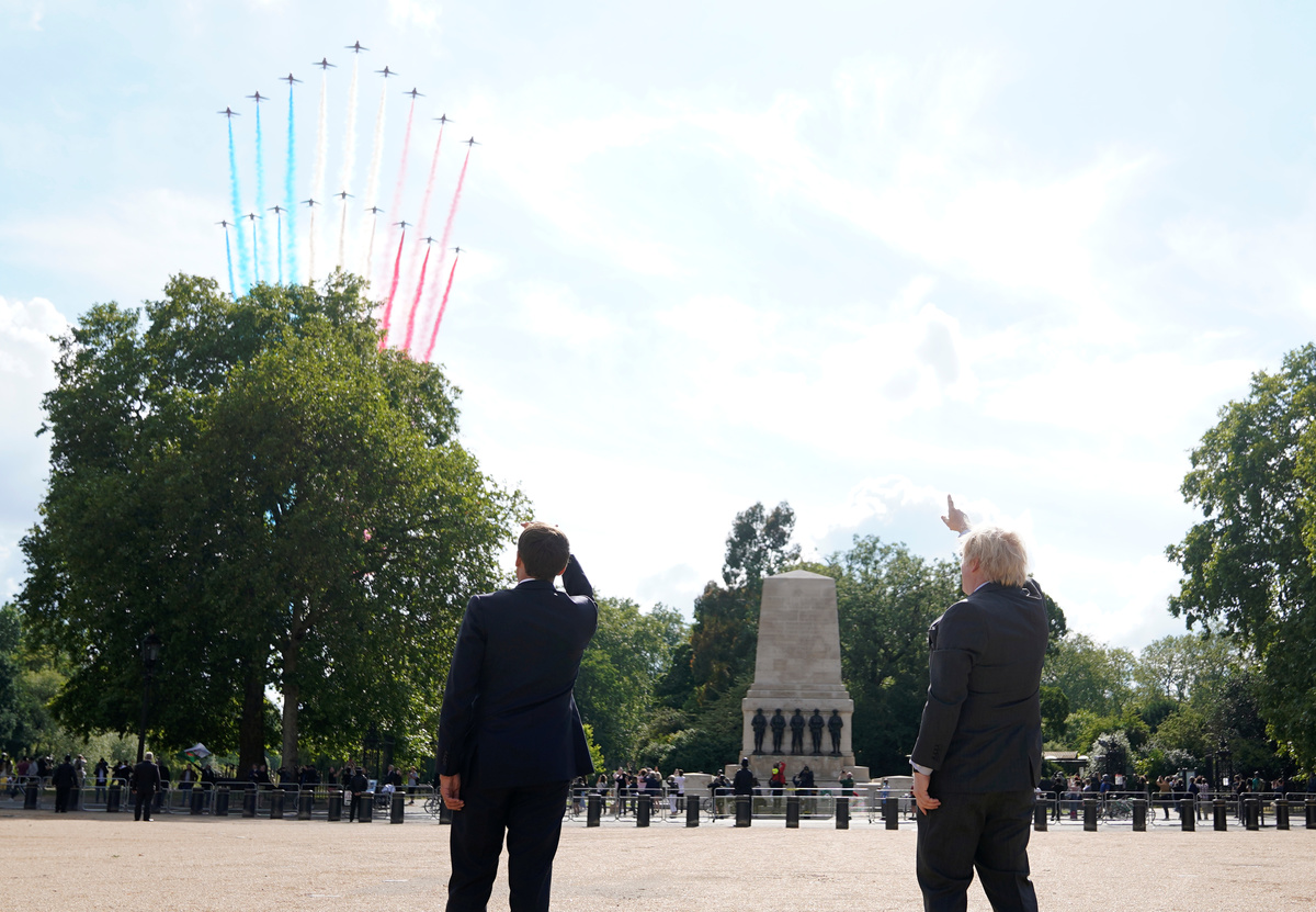 The queen spoke to Macron over the phone during his visit, and Johnson later watched a flypast by British and French aerobatic teams with their red, white and blue vapour trails.