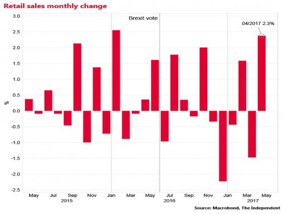 Retail sales jumped by 2.3 per cent in April, well ahead of expectations, suggesting the UK consumer might be more resilient than feared.