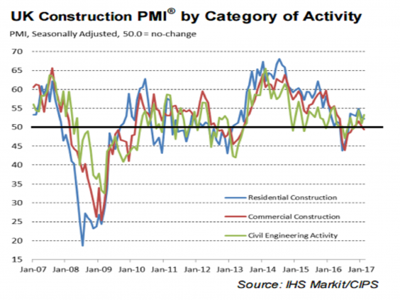 The increase was driven by the civil engineering index, while house building growth fell to its weakest level in six months and commercial construction slipped into contraction territory.