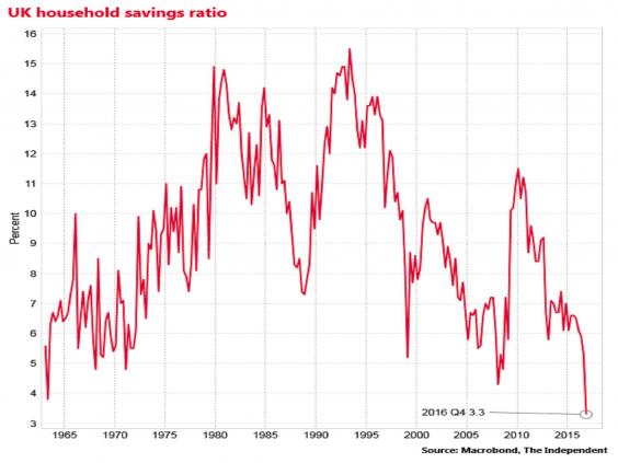 Nevertheless, robust consumer spending has supported growth since last June's Brexit vote, enabling the economy to defy expectations of a recession. And the savings ratio has been on a declining trend since the beginning of 2016.