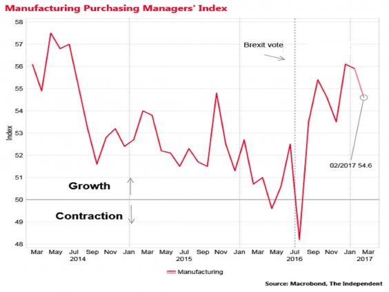 The manufacturing PMI plunged into contraction territory in the immediate wake of last year's referendum but then shot up at a record pace.