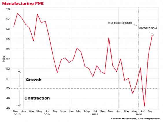 The latest Markit/CIPS Purchasing Managers’ Index reading jumped to 55.4 in September, up from 53.3 in August, with any figure above 50 showing expansion.