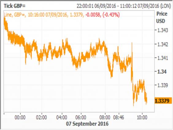 The news sent sterling down more than half a cent against the dollar to $1.3379, giving back some of the strong gains of yesterday.