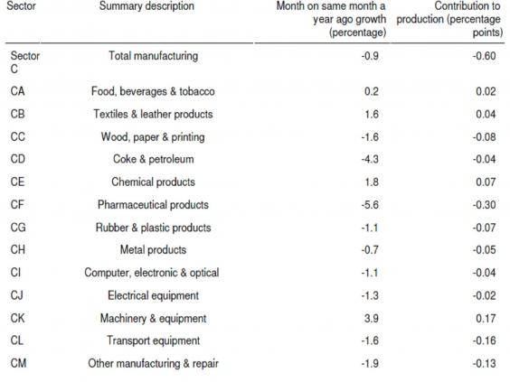 The ONS reported that the biggest drag had been from pharmaceuticals, but electronics, transport equipment and wood production also fell. Nine of the 13 subsectors showed a contraction.