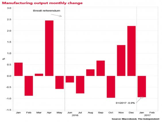 Manufacturing output fell in January at its joint fastest rate since the Brexit referendum, official data on Friday showed, but over the last quarter output is up strongly.
